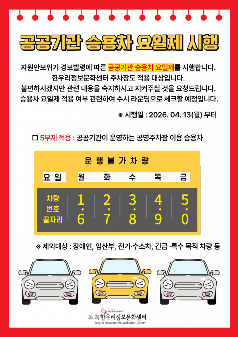 [공지사항] 공공기관 승용차 요일제 시행 안내
