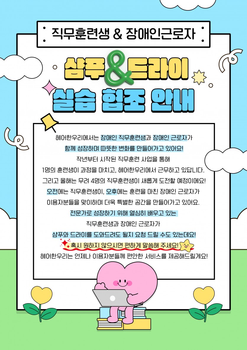 전문가로 성장하기 위해 열심히 배우고 있는 직무훈련생과 장애인 근로자가 샴푸와 드라이를 도와드려도 될지 요청 드릴 수도 있는데요!